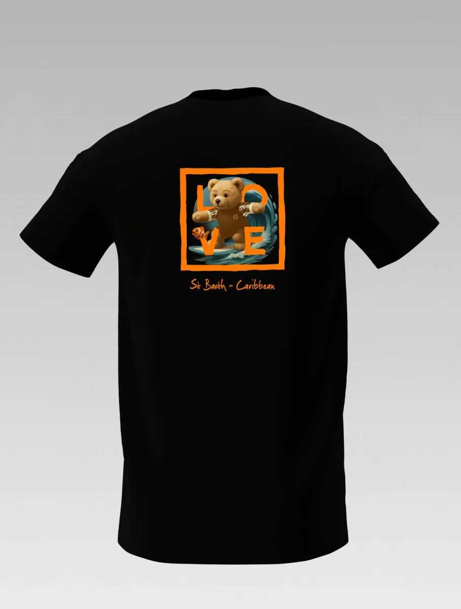This black T-shirt from St Barth & St Martin, under the LOVE line, captures the essence of summer with its joyful and vibrant design.