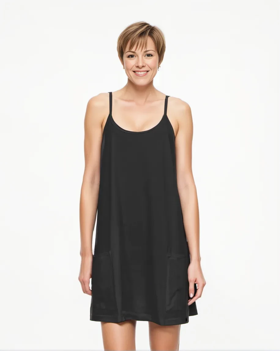 The dress falls just above the knees, featuring a delicate bustier with fine "dauphine" straps in the front. At the back, the straps form a "Marcel" tank shape, leaving the shoulders beautifully exposed for a chic yet casual look.