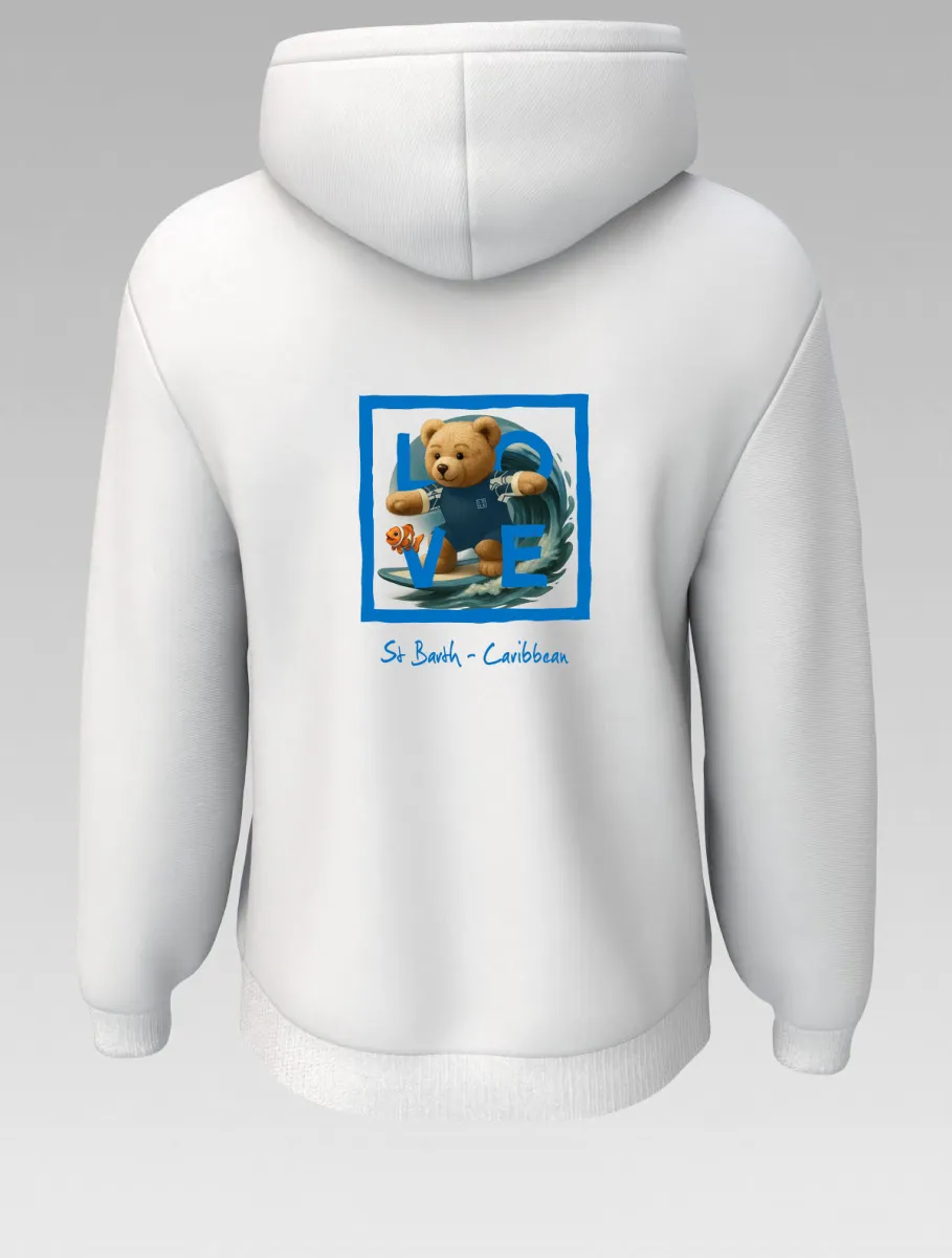 This white LOVE hoodie features the brand's iconic bear — a symbol of freedom, joy, surfing, and marine adventures. The design showcases the bear on a surfboard, with multiple color variations of the LOVE logo for extra fun and style.