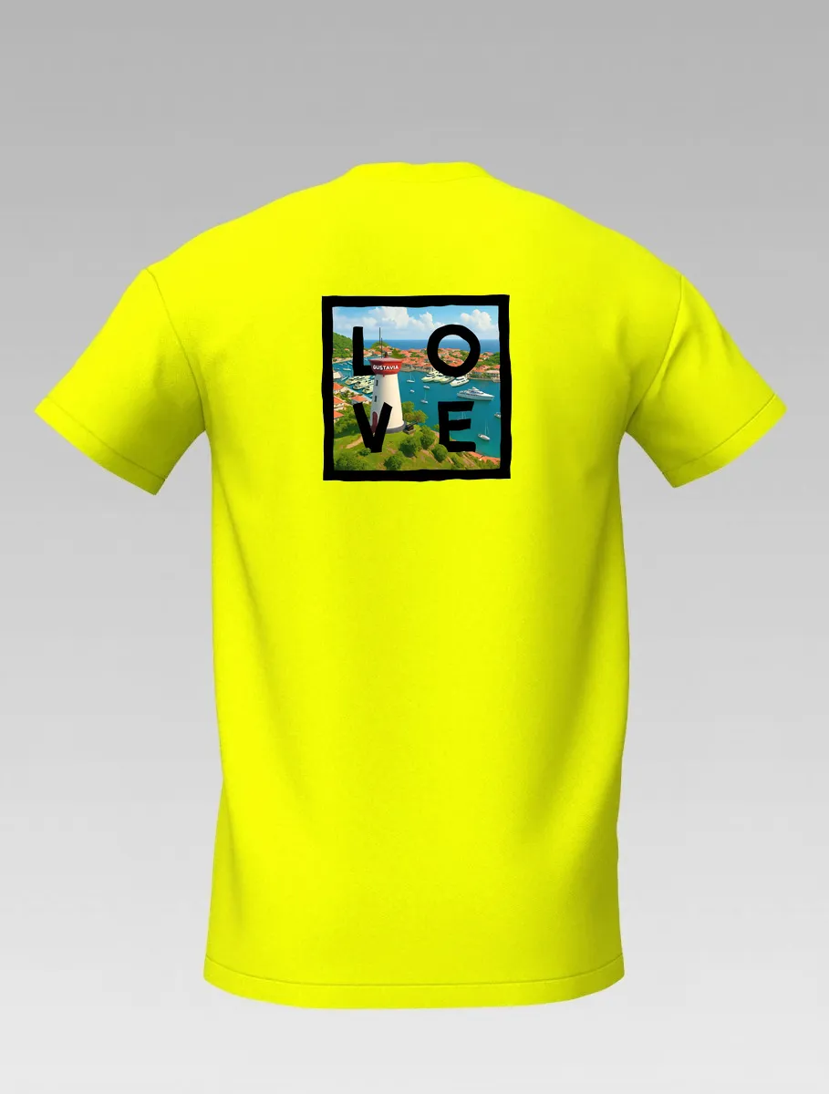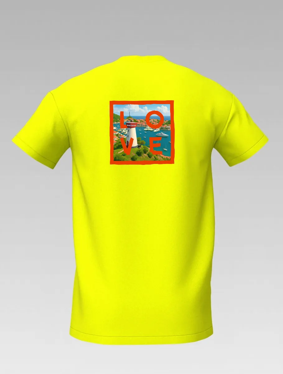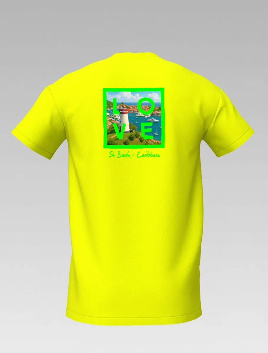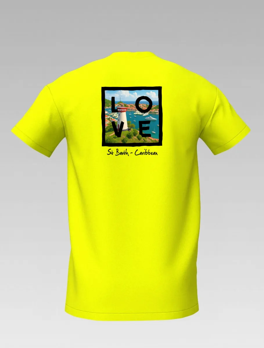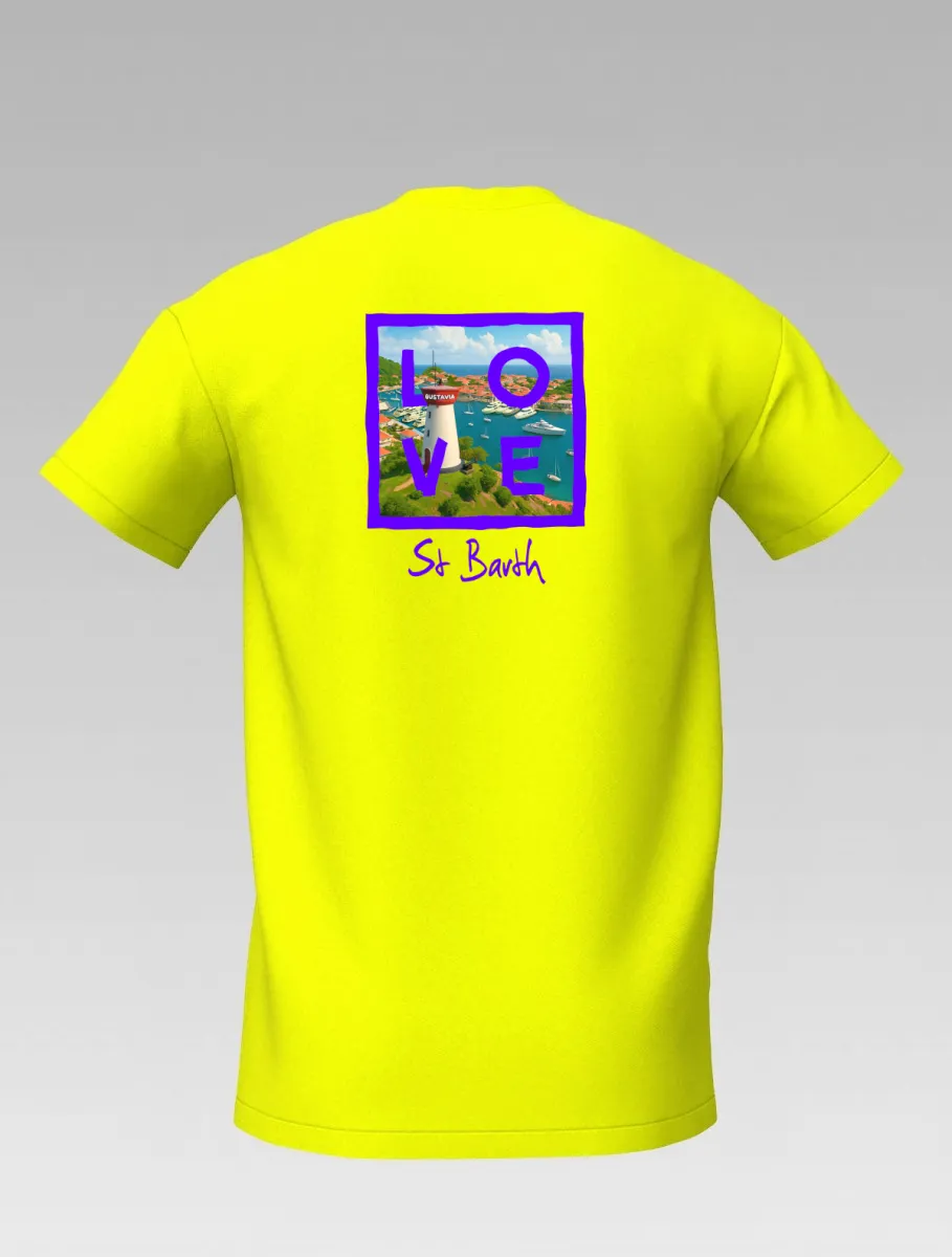 This yellow T-shirt from St Barth Signature, part of the LOVE Edition, celebrates the beauty of Gustavia Harbor, where boats rest on turquoise waters and colorful houses light up the horizon.